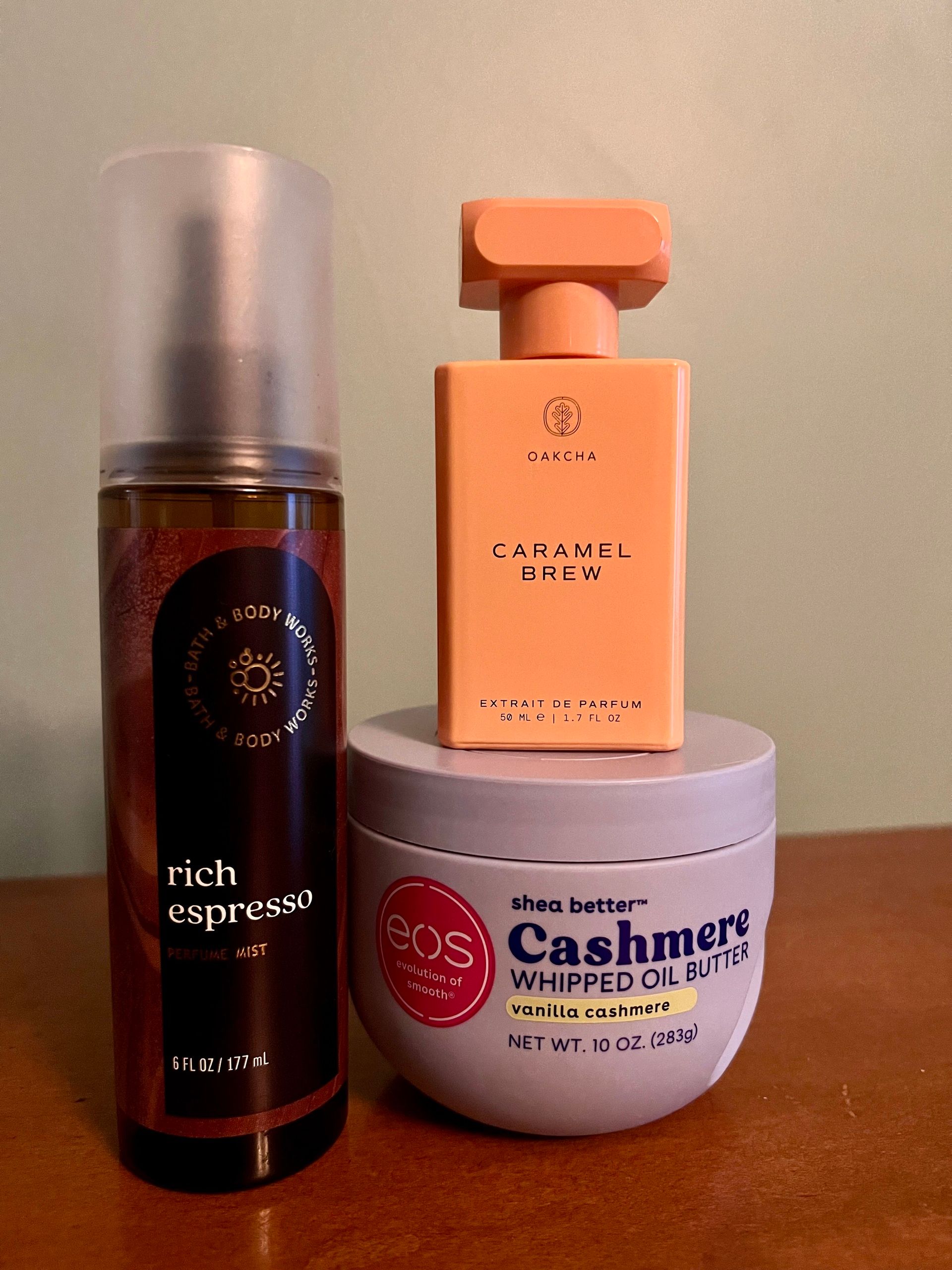 This month’s perfume, body butter, and body mist are pictured on a wooden dresser.