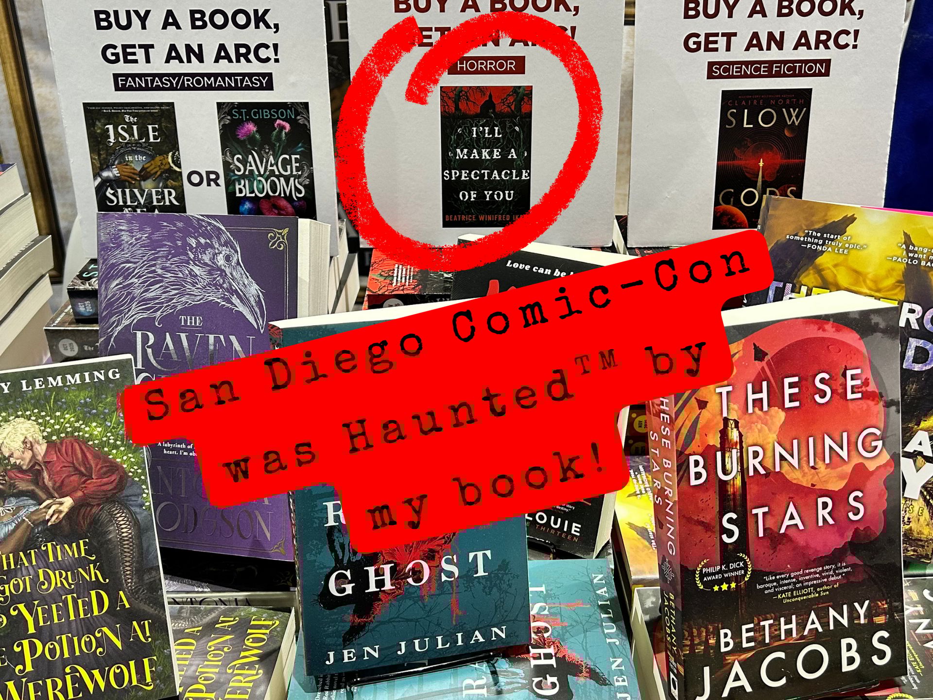 I’ll Make a Spectacle of You is pictured at San Diego Comic-Con, along with many other Hachette/Orbit/Run For It books.